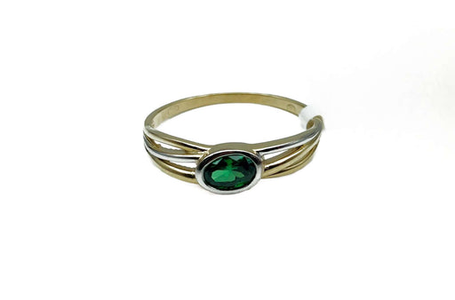 Leuchtend grüner ovaler synthetischer Smaragd in einer schlichten Zargenfassung. Zart anmutende Goldreifen in Gelb-und Weißgold führen den Blick au...