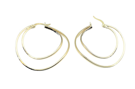 Modische Creole mit zwei Außenringen in poliertem Gelbgold in deren Mitte sich eine Weißgoldwelle schlängelt. Die sich ergebenden Räume sind mit fu...