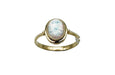 Im Mittelpunkt dieses 585/- Gelbgold Ringes steht der cabochongeschliffene synthetische Opal der wunderschön in rot,gelb und grün fluoresziert. Der in Zarge gefasste 8 x 6 mm große Stein wird durch den kleinen Spiegel fein eingerahmt. Insgesamt kommt das Musterteil auf eine Größe von 10,2 x 9 mm.